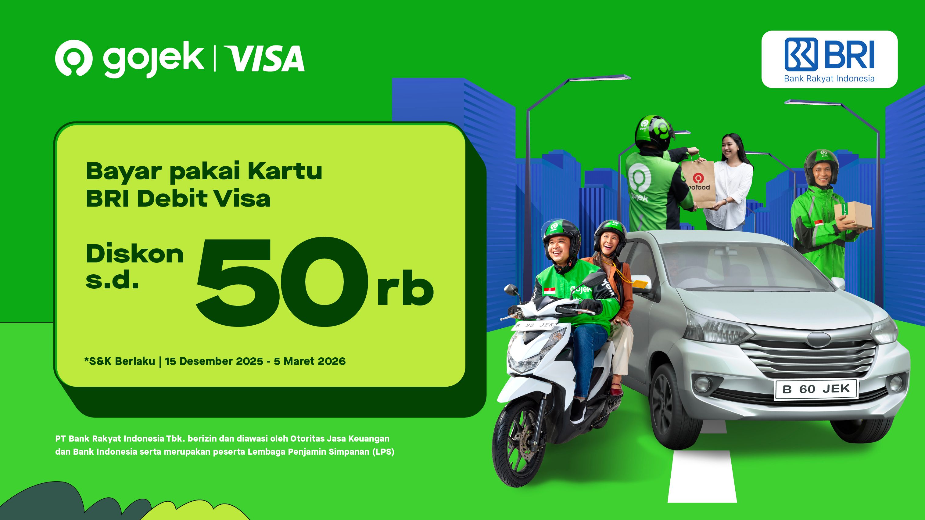 Kabar gembira untuk kamu pengguna Bank BRI! Sekarang kamu bisa makin hemat pakai GoFood, GoCar, GoRide dan GoSend kalau bayarnya pakai Kartu BRI Debit Visa.