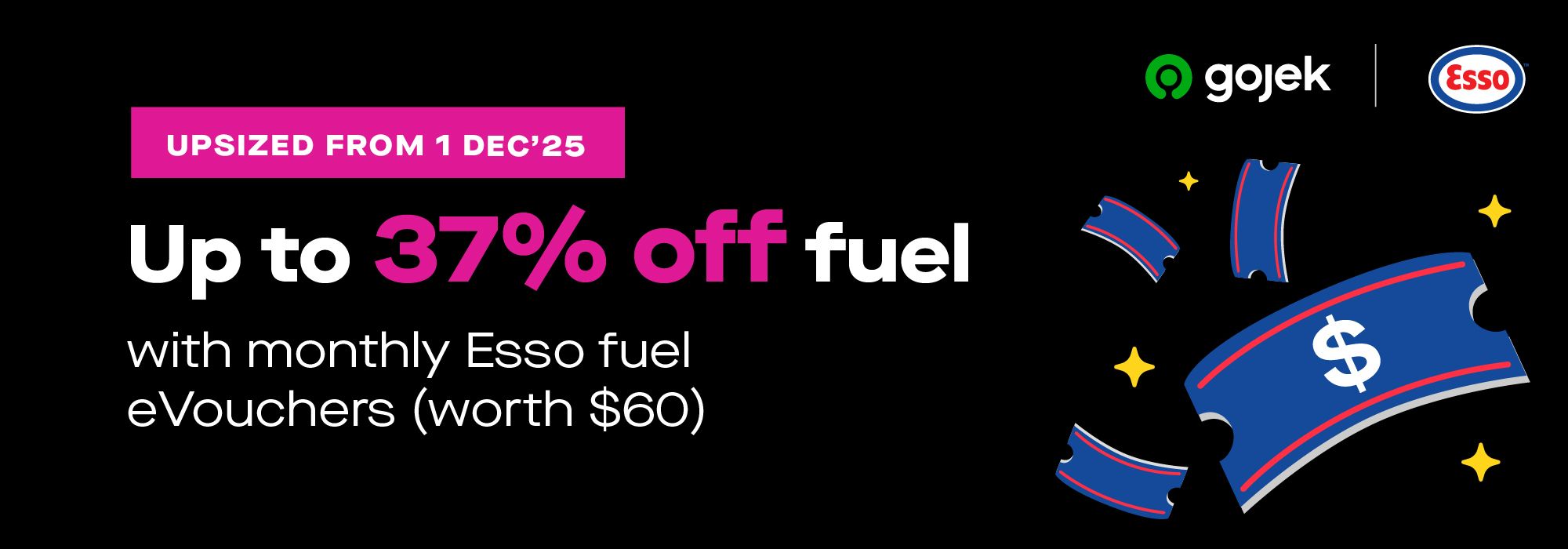 From 1 Dec 2025, all active Gojek driver-partners can enjoy up to 32% upfront savings on fuel at all Esso stations islandwide, inclusive of UPSIZED monthly eVouchers worth $60, when you drive with Gojek.